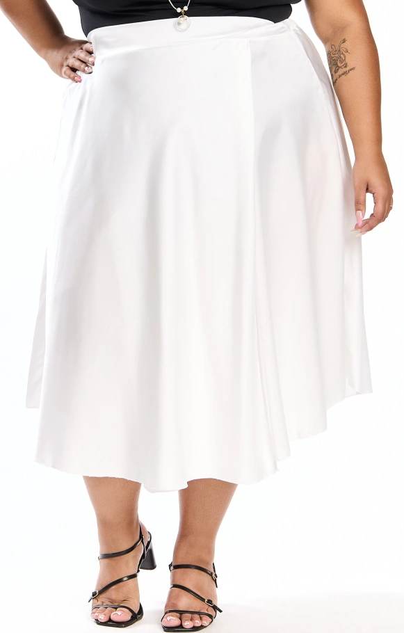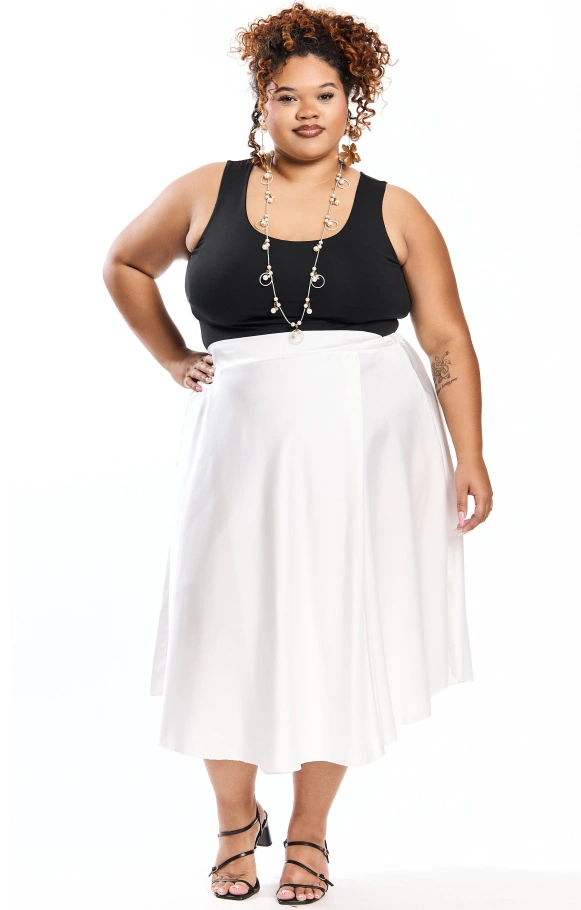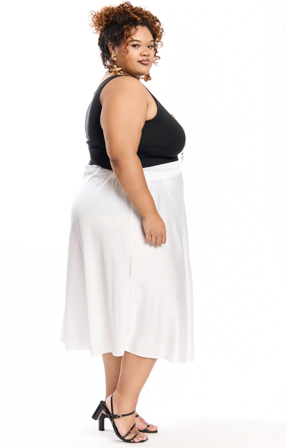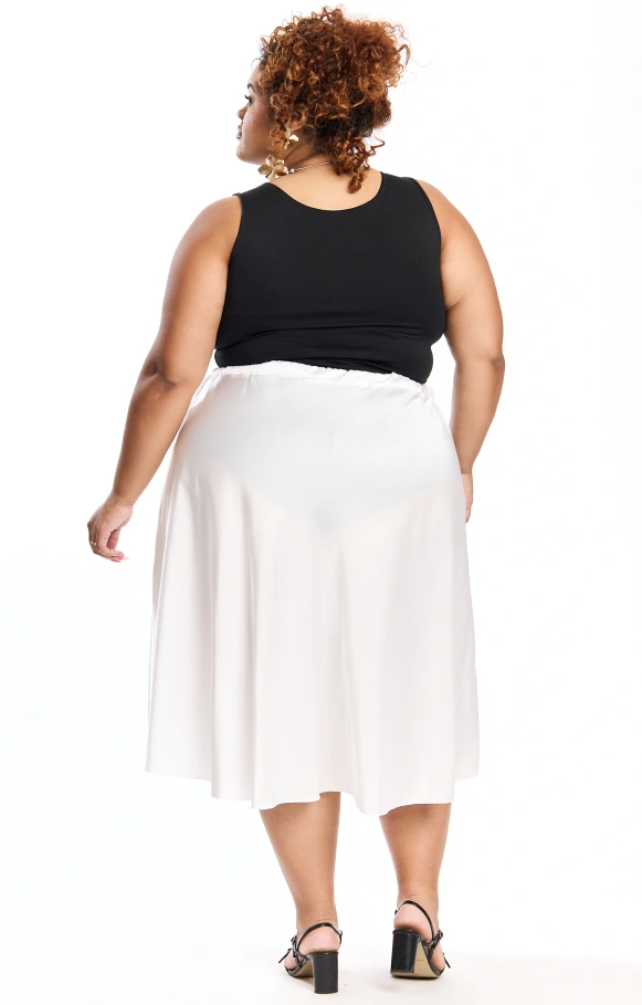 Thais est la petite sœur de Thaissa, une jupe évasée en satin en version mi-longue, pour apporter légèreté et glamour à votre tenue.