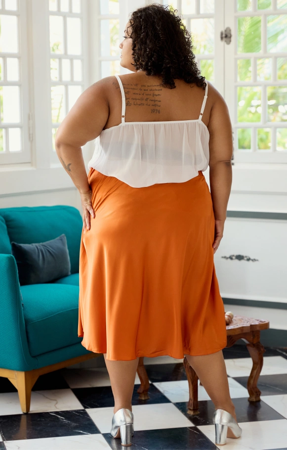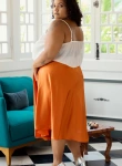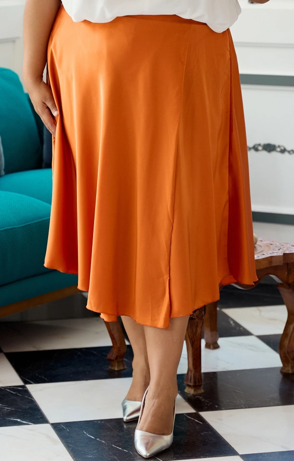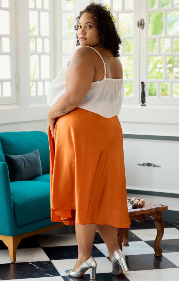Thais est la petite sœur de Thaissa, une jupe évasée en satin en version mi-longue, pour apporter légèreté et glamour à votre tenue.
