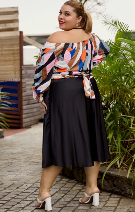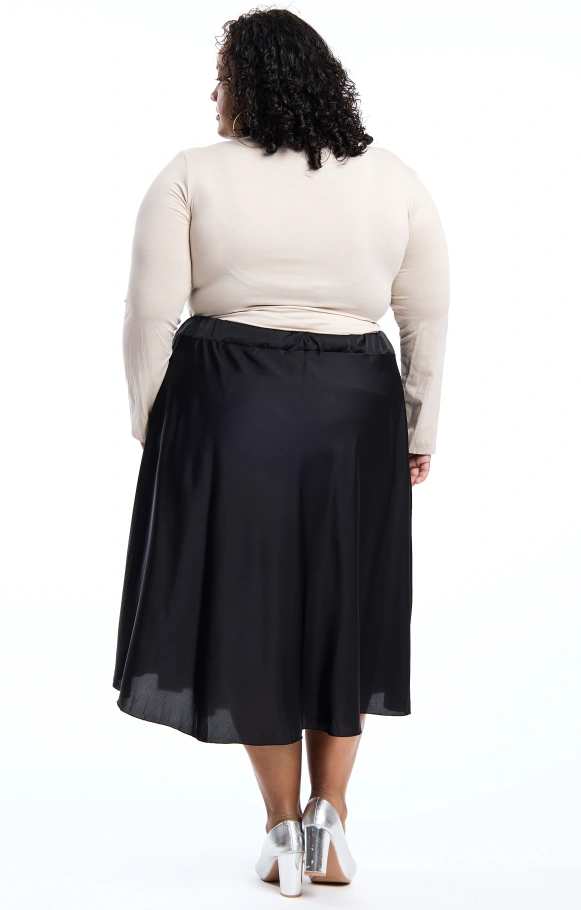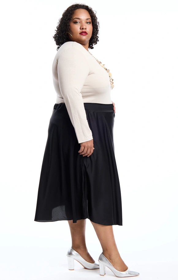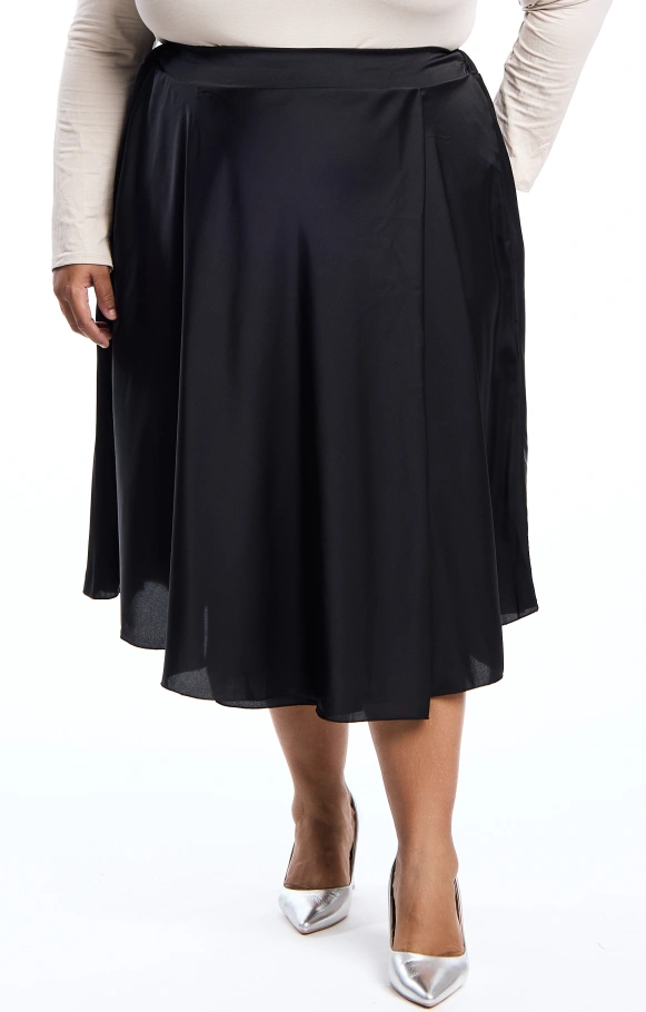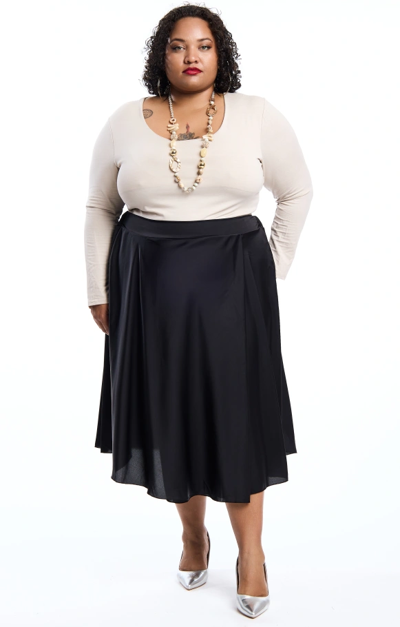 Thais est la petite sœur de Thaissa, une jupe évasée en satin en version mi-longue, pour apporter légèreté et glamour à votre tenue.
