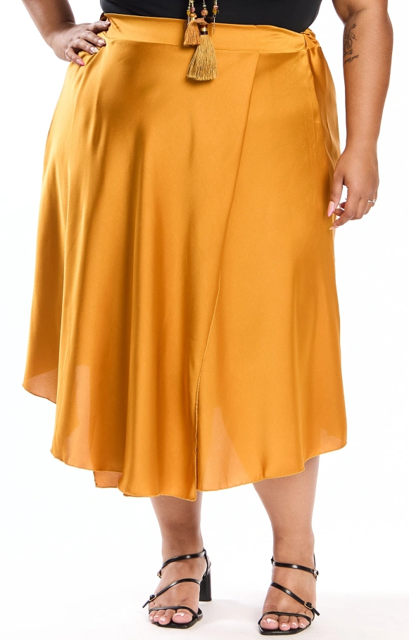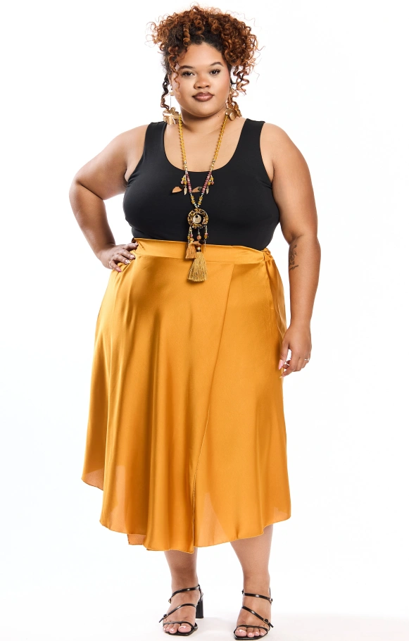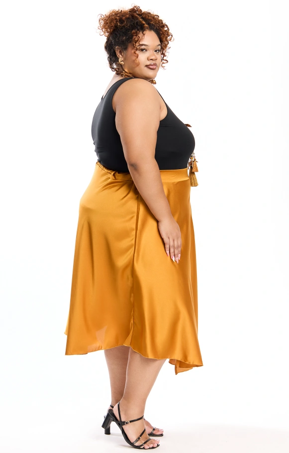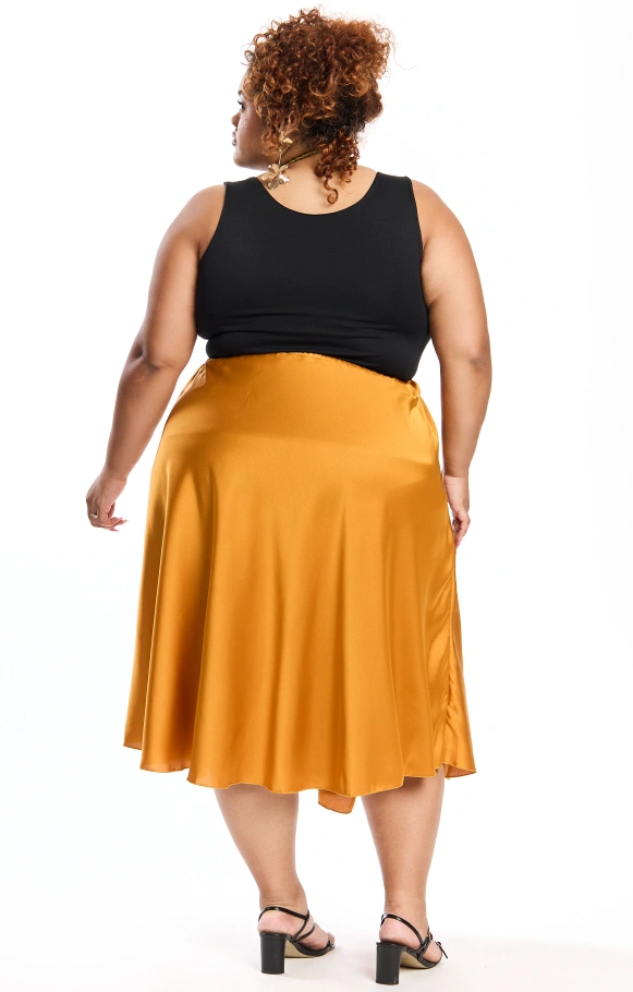 Thais est la petite sœur de Thaissa, une jupe évasée en satin en version mi-longue, pour apporter légèreté et glamour à votre tenue.