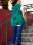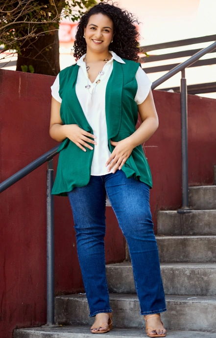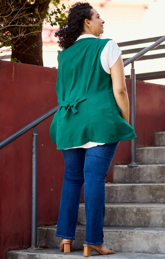 Le gilet Erika est une pièce élégante qui se distingue par sa coupe ouverte et son système ajustable au dos, permettant de structurer et marquer la silhouette en toute subtilité.