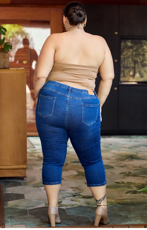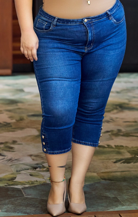 Le pantacourt Andy en jean's à la coupe ajustée, avec ses petits boutons aux mollets, est le pantacourt qui flattera votre silhouette tout en étant un atout pratique pour votre quotidien.