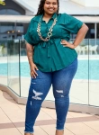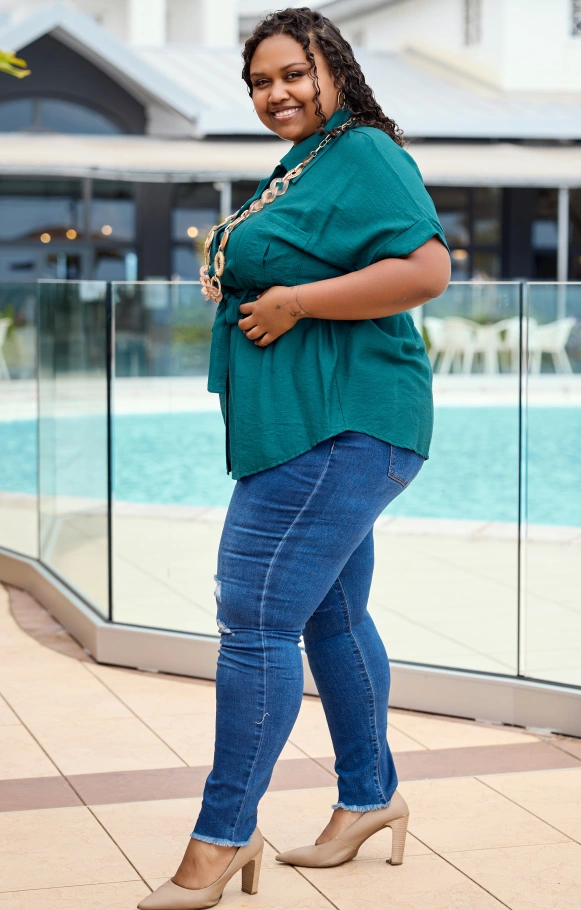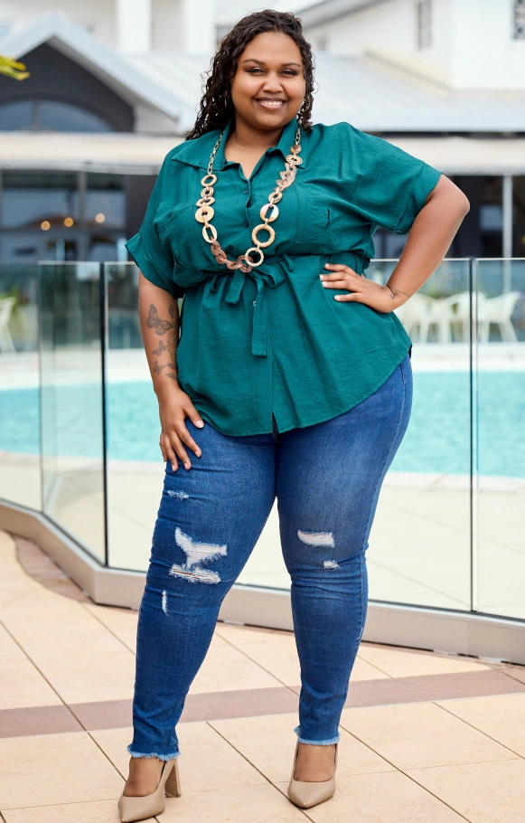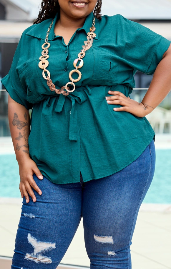 Elle présente un col classique, des boutons sur le devant, deux poches à rabat et une ceinture à nouer soulignant joliment la taille.