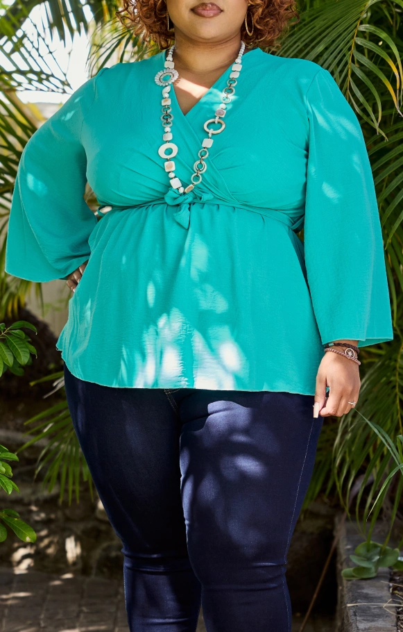 Lorencia est un incontournable top cache-cœur cintré en dessous de la poitrine, ajustable avec une ceinture et aux manches mi-longues évasées.