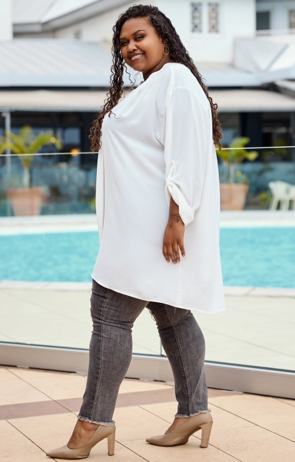 Inspirée de la blouse Maha, la tunique blouse Mahdia offre une coupe plus longue et fluide pour un tombé tout en légèreté.
