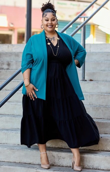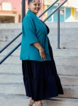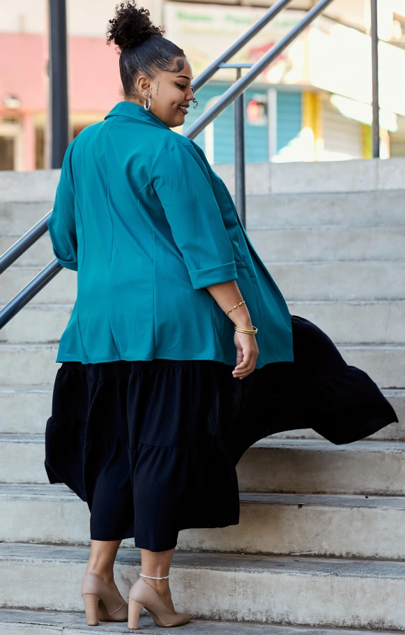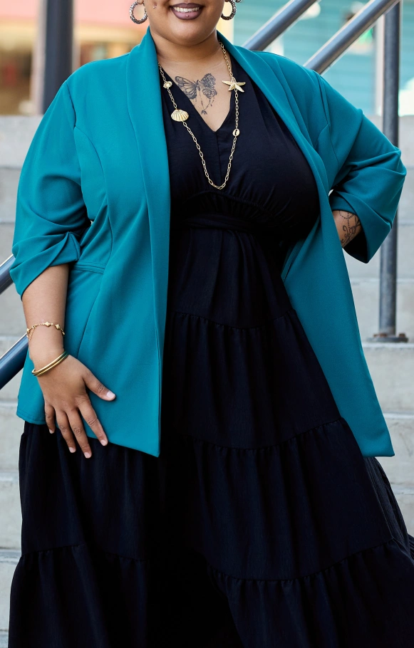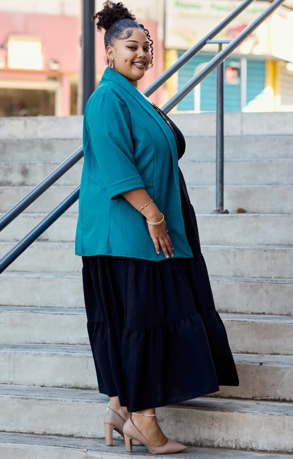 La veste Ilouka combine élégance et confort avec sa coupe ouverte, ses manches 3/4 à revers et sa matière fluide extensible.